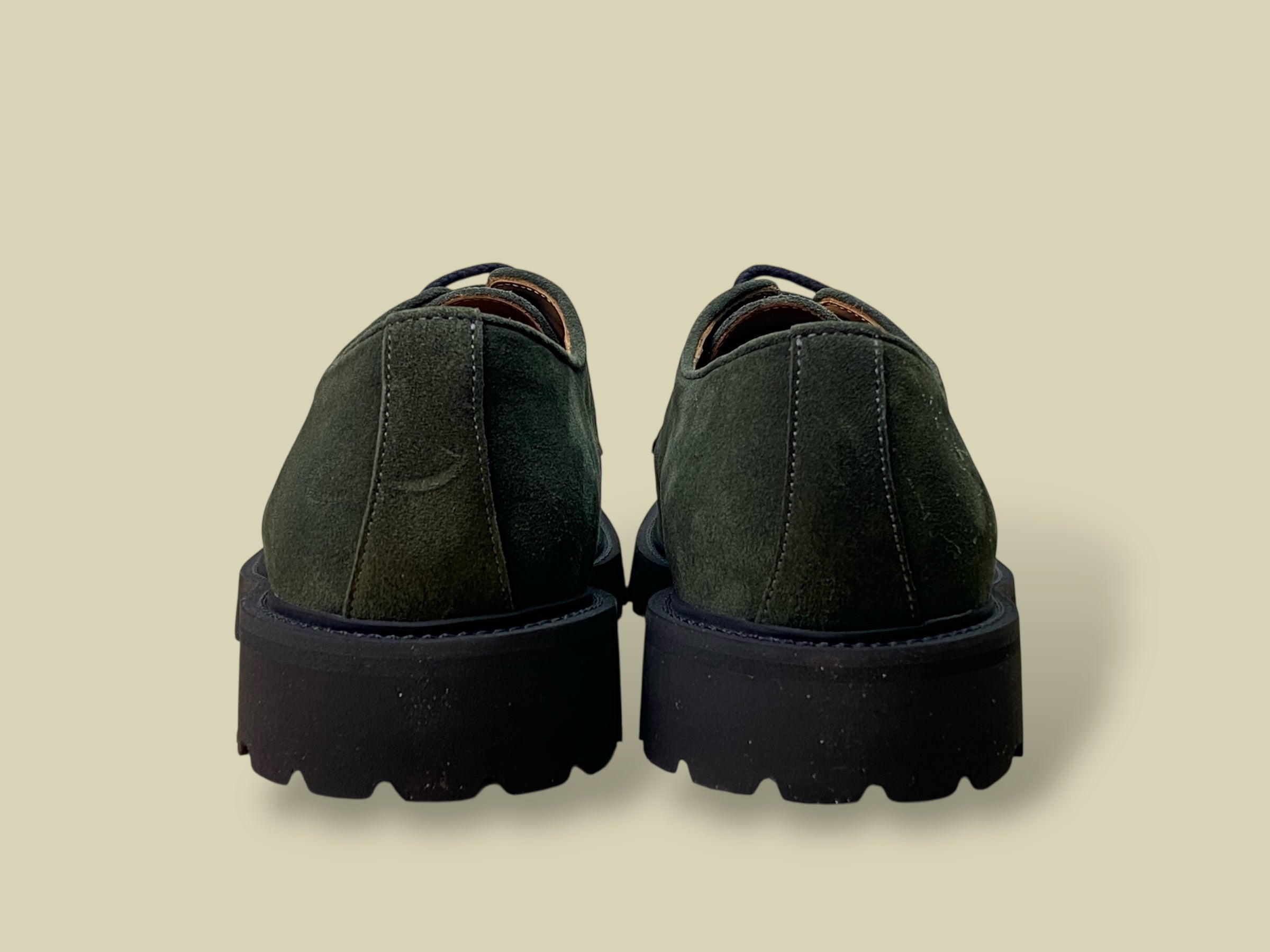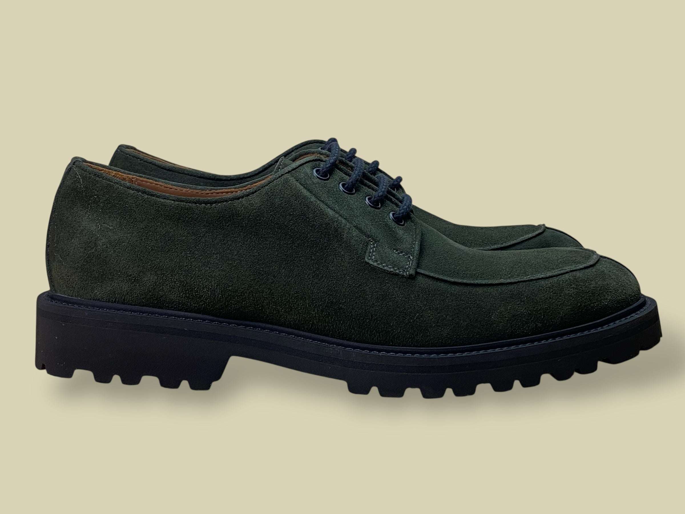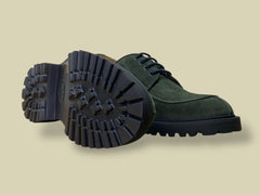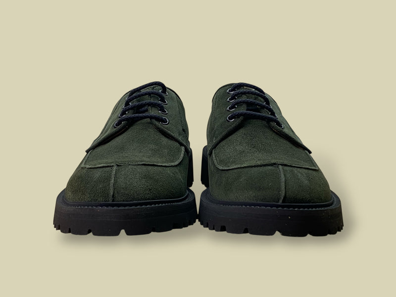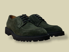 Tomaia in camoscio verde con occhielli in metallo.